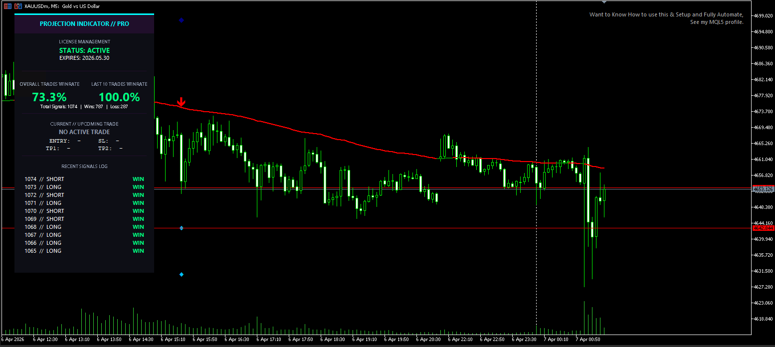 While it works on all Forex and Crypto pairs, the Projection Indicator is a masterclass in 5-minute Gold trading. Optimized for the unique volatility of XAUUSD.